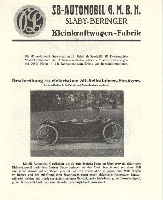 Jørgen Skafte Rasmussen , propietario de la fábrica de motores Zschopau , fabricante de motocicletas DKW de dos tiempos , conoció a Rudolf Slaby en Berlín en el verano de 1919. Slaby conducía un pequeño coche eléctrico. Rasmussen, entusiasmado, encargó de inmediato a Slaby cien unidades , a las que llamó Slaby-Beringer , y las puso a la venta en la Feria de Muestras de Leipzig . El coche pesaba 180 kg, incluidas las baterías.