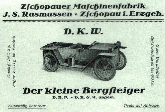 Para evitar la pérdida de sus inversiones, Rasmussen adquirió los restos de la empresa de la masa de la quiebra y los incorporó a su grupo como J. S. Rasmussen AG, sucursal de Berlín . Rudolf Slaby se convirtió en diseñador y director técnico de la empresa de Rasmussen y creó el primer automóvil DKW en 1927/28. El DKW P15 PS , con un motor de motocicleta de dos tiempos y dos cilindros refrigerado por agua , tenía una carrocería autoportante de madera contrachapada .
