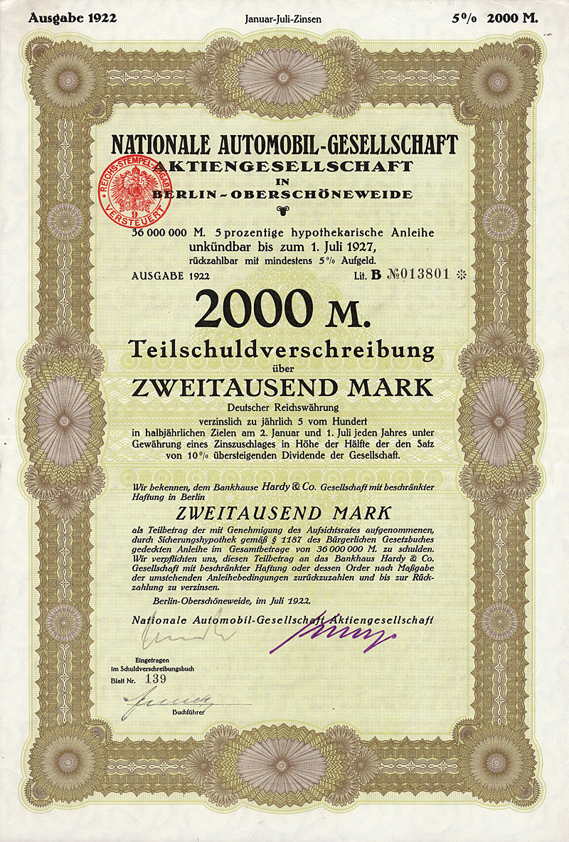 Obligación parcial por 2000 marcos emitida por la National Automobile Company AG en julio de 1922. Autores y artistas gráficos desconocidos; escaneo de la casa de subastas Vladimir Gutowski