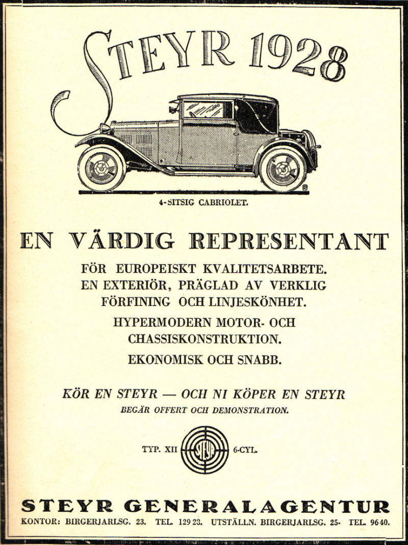 Anuncio sueco del Steyr Type Xll de 6 cilindros y 4 asientos convertible de 1928
