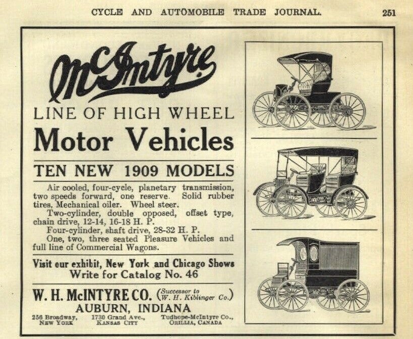 La compañía W.H. McIntyre fabricaba tanto buggies como vehículos de ruedas altas. Se ofreció una línea de vehículos de ruedas altas de dos y cuatro cilindros con un diseño que no infringía patentes. La línea de vehículos de ruedas altas de McIntyre, que incluía runabouts , turismos y camiones, aumentó hasta que hubo diez modelos diferentes disponibles. Para 1911, McIntyre introdujo una línea de vehículos estándar al hacerse cargo del America de 4 cilindros y 40 hp producido por la Motor Car Company (Nueva York), que se comercializó como el McIntyre Special. El McIntyre Limited de seis cilindros y 40 hp se añadió en 1913, pero McIntyre era visto como un fabricante de vehículos de ruedas altas y estos coches no se vendieron bien.