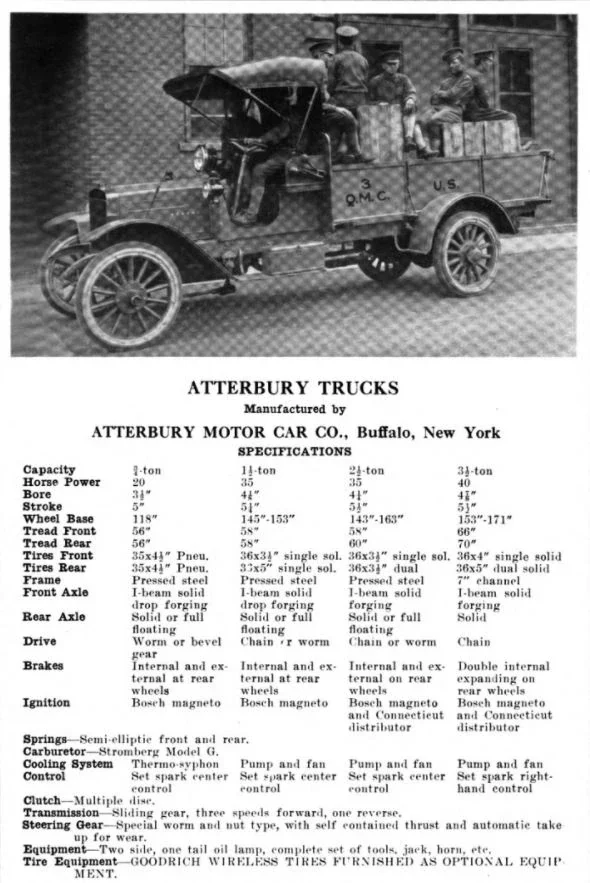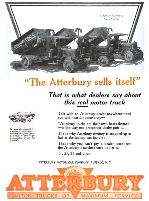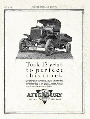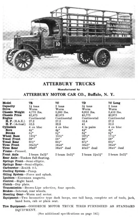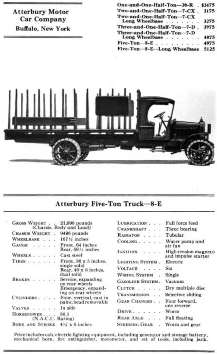 A finales de 1910, la marca volvió a llamarse Atterbury . Los camiones tenían una capacidad de carga de entre 1,5 y 7 toneladas. Diversos motores de gasolina de Buda , Continental y Lycoming impulsaban los vehículos.