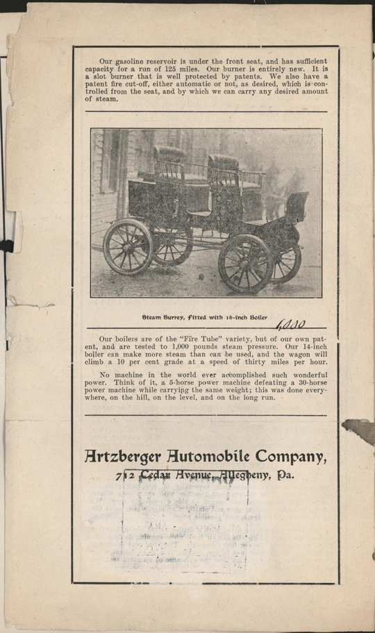 Una serie de modelos era de vapor y contaba con transmisión por cadena. Se conoce un Surrey de 1901. En 1902, se ofrecieron las carrocerías roadster ligero , Touring Wagon , Surrey y Speed Wagon . En 1903, solo había un roadster ligero en la gama.