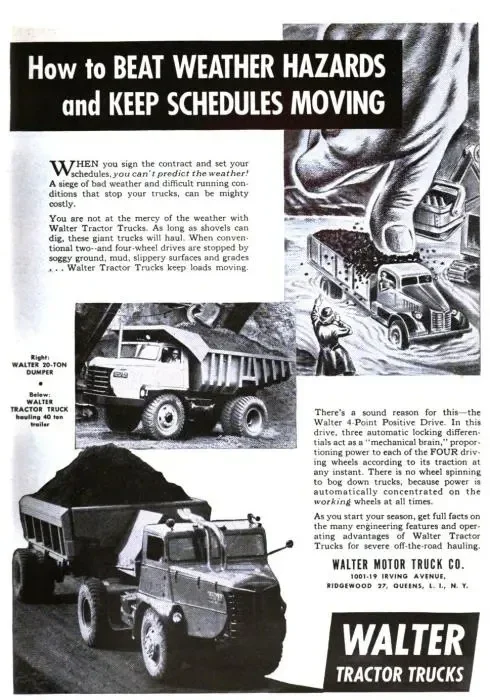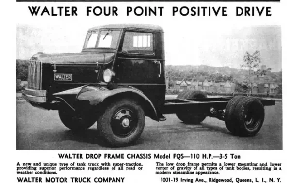 William Walter fue un exitoso fabricante de maquinaria para la industria de la confitería en Nueva York, quien fabricó automóviles de alta calidad llamados Walter entre 1902 y 1909 . En 1909, Walter comenzó a fabricar camiones, y en 1911 aparecieron los primeros camiones Walter con tracción en las cuatro ruedas. Estos camiones se convirtieron en el producto principal de la Walter Motor Truck Company y, en un principio, se basaban en el camión francés Latil y se fabricaban en una gama de tamaños con capacidades desde 1,5 hasta 7 toneladas. También se fabricaron camiones Walter convencionales con tracción trasera y delantera.