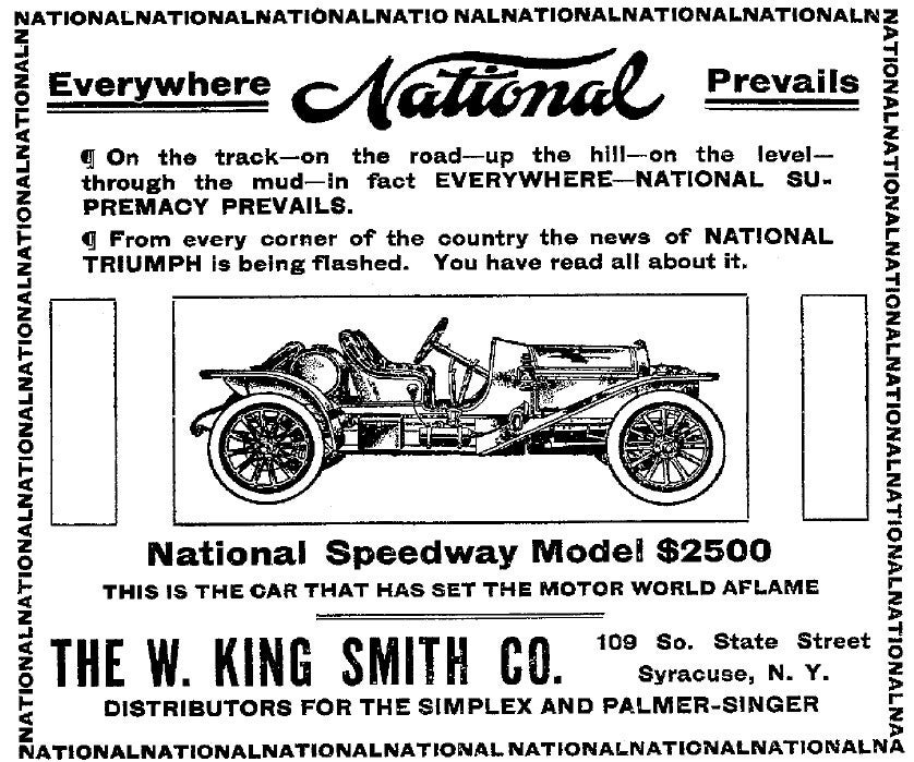 National tuvo la trayectoria más envidiable y exitosa de todos los autos de carreras estadounidenses antes de la Primera Guerra Mundial. Por ejemplo, en 1911, en una combinación de carreras en carretera, carreras de velocidad, subidas de montaña y carreras en pista de tierra, ganaron un total de 84 veces, quedaron segundos 48 veces y terceros 30 veces.