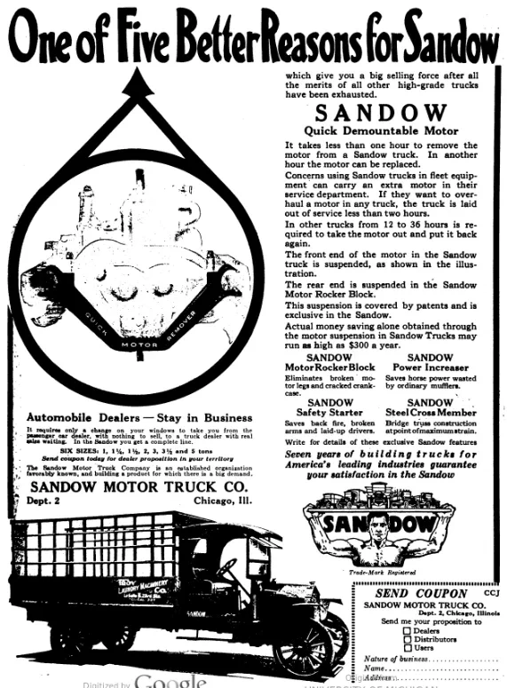 La gama de camiones Sandow se amplió durante la década de 1920 para incluir modelos de 1 tonelada, 2,5 toneladas, 3,5 toneladas y 5 toneladas de capacidad. El modelo de 1 tonelada usaba neumáticos, mientras que los de mayor capacidad tenían neumáticos de caucho macizo.