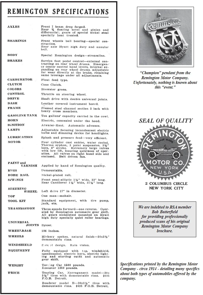 Philo E. Remington, nieto del fundador de Remington Arms , y Peter A. Stubbebein fundaron Remington Automobile & Motor Company en 1900. Su sede estaba en Ilion , Nueva York . Adquirieron una fábrica en la misma ciudad y compraron el equipo de la extinta Quick Manufacturing Company . William A. Schmidt diseñó el motor. La producción de automóviles comenzó ese mismo año, con ventas a partir del 30 de octubre de 1900. La marca era Remington . James S. Holmes se convirtió en gerente general. Para la primavera de 1901, solo se habían fabricado siete vehículos. La compañía se mudó entonces a Utica , también en Nueva York. En noviembre de 1902, los problemas financieros se hicieron públicos, lo que llevó a la bancarrota unas semanas después .