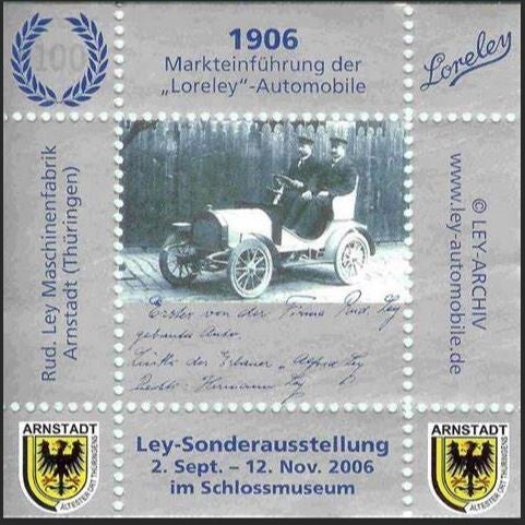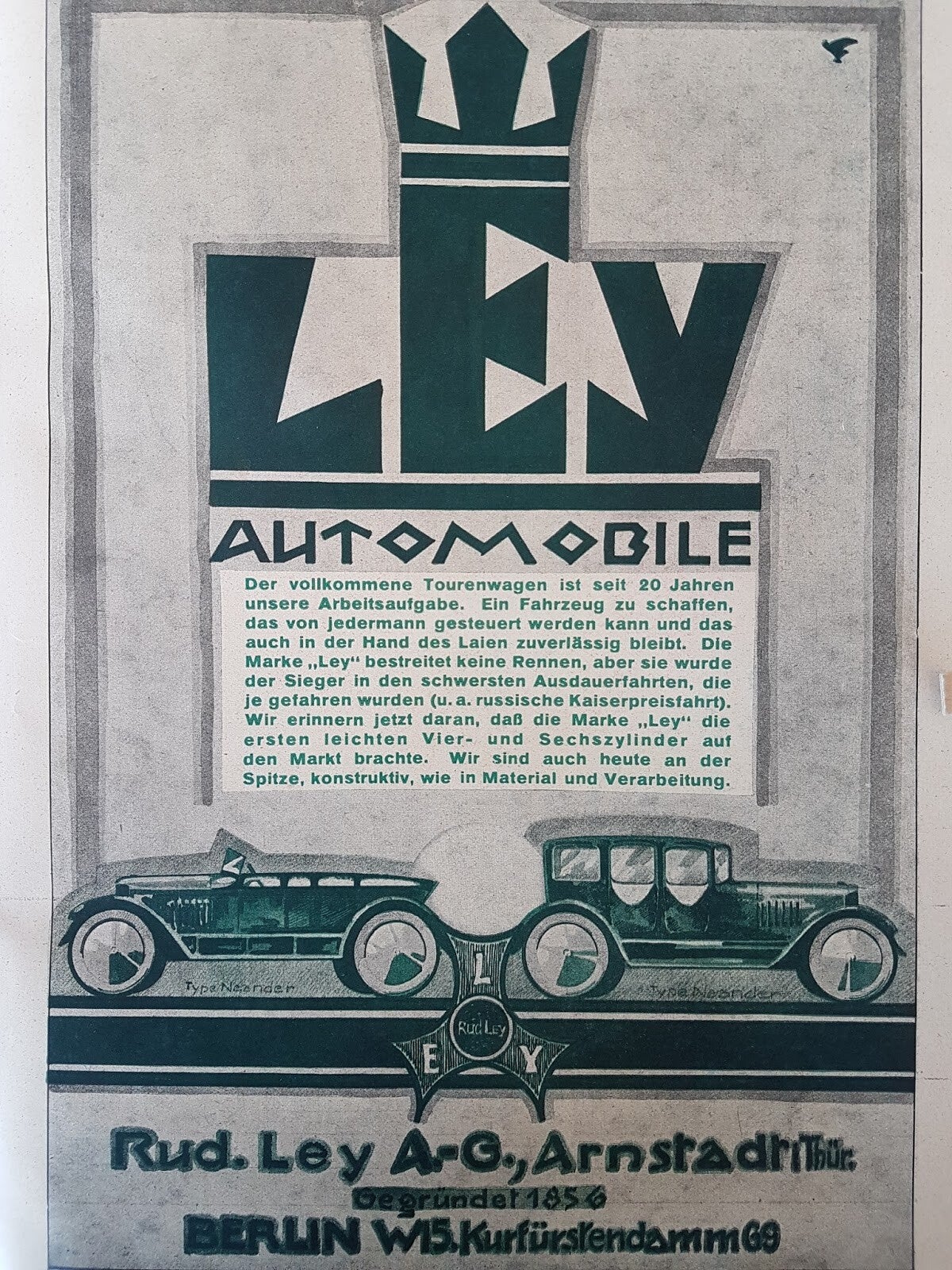 La Rud. Ley Maschinenfabrik AG (Fábrica de Máquinas Rud. Ley) existía en Arnstadt/Turingia desde 1856, especializándose en la producción de maquinaria para la fabricación de calzado, como máquinas de coser cuero. En 1905, lanzaron su primer automóvil ligero, un motor de cuatro cilindros de 6/10 CV con 1500 cc. Este modelo, al igual que todos los modelos posteriores antes de la Primera Guerra Mundial, se comercializó con el nombre de Loreley . Para 1914, se habían producido un total de siete modelos diferentes de cuatro o seis cilindros, construidos como turismos de dos o cuatro plazas. Los coches se vendieron tan bien que, para 1910, Ley contaba con unas 1200 personas en Arnstadt.