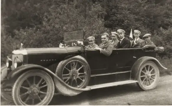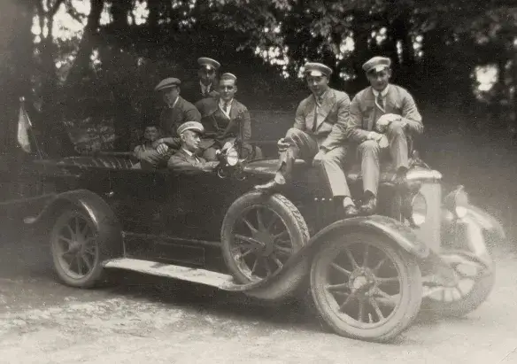 Presto Typ P 8/25 hp con radiador puntiagudo, fabricado entre 1913 y 1919; probablemente una foto de posguerra con soldados alemanes. Fotografía original de la colección de Michael Schlenger