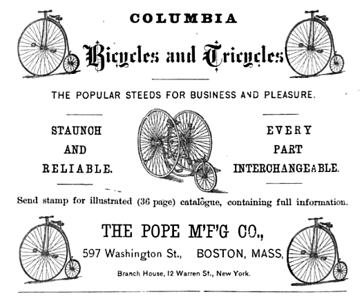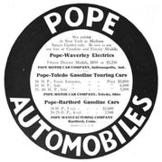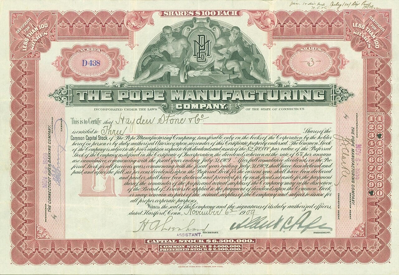 La Pope Manufacturing Company figuraba en el Directorio de la Ciudad de Boston de 1876, ubicada en el número 54 de High Street. En marzo de 1877, la empresa redactó sus documentos de constitución en Connecticut , nombrando a Albert Pope, Charles Pope y Edward Pope como accionistas. Al momento de la constitución, Albert Pope poseía 595 acciones, su padre Charles 400 y su primo Edward cinco. Los documentos de constitución establecían las actividades comerciales previstas de la empresa: «fabricar, vender y conceder licencias para fabricar, vender y vender pistolas y armas de aire comprimido, máquinas de zurcir, tornos de aficionado, liadoras de cigarrillos y otros artículos patentados, así como poseer, vender y negociar patentes y derechos de patente para su fabricación». La Pope Manufacturing Company ya vendía pistolas de aire comprimido y liadoras de cigarrillos.