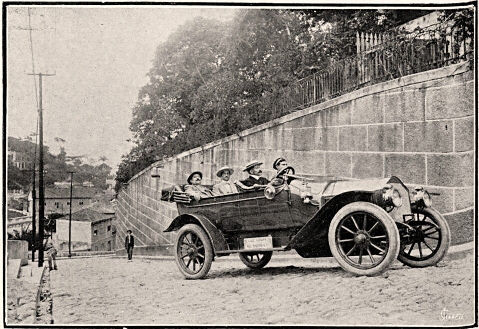 Una vehículo de Luc Court es sometida a una prueba de ascenso (pendiente del 35%) en el barrio de Santa Teresa, Río de Janeiro, 1912