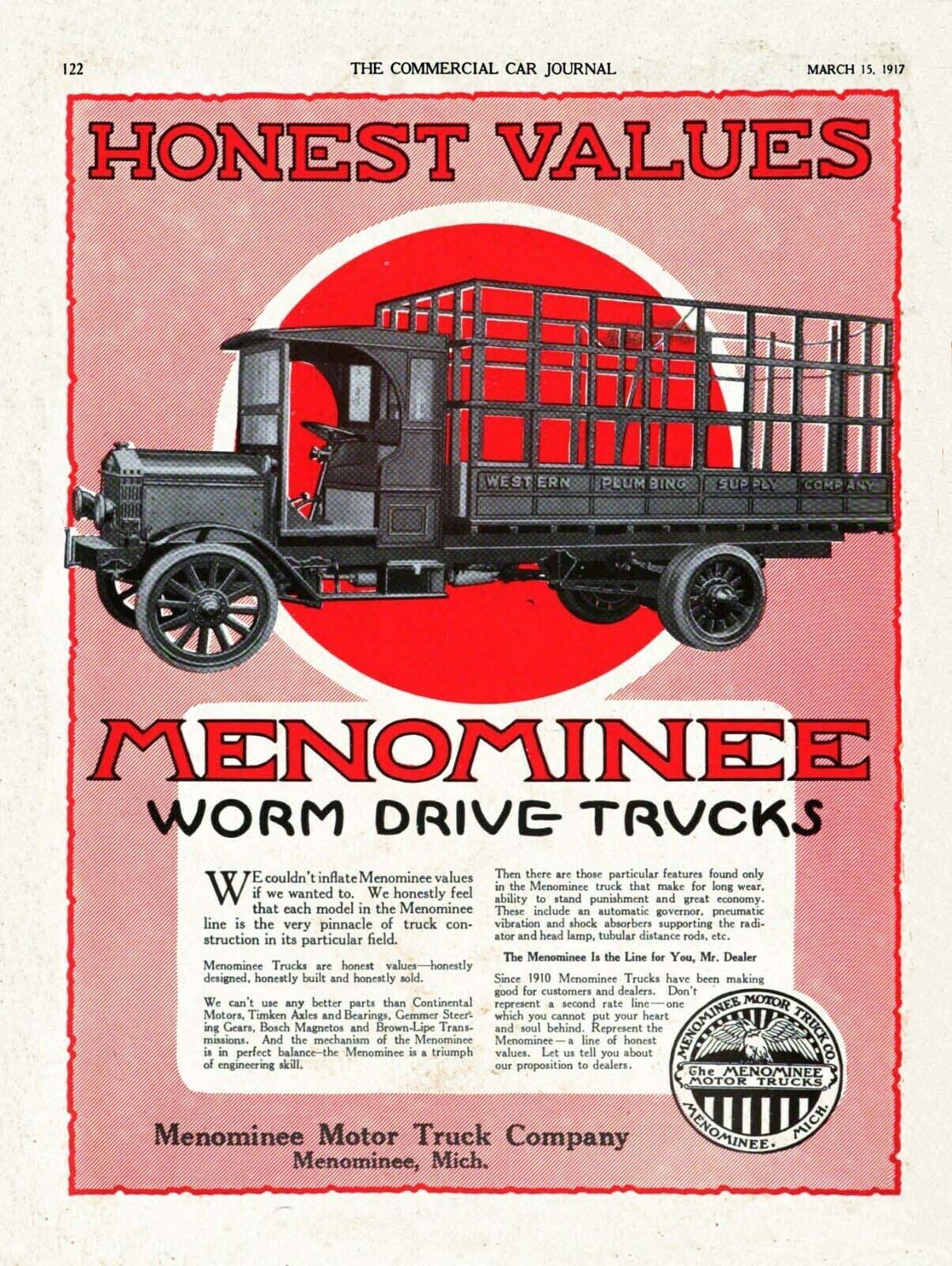 La compañía D.F. Poyer comenzó a fabricar camiones en un edificio de ladrillo de reciente construcción, conocido incluso hasta hace poco como el Poyer's Garage, en la calle principal de Menominee. El negocio de camiones de Menominee prosperó y en 1911 se construyó una fábrica. El "Menominee" era un camión ensamblado que utilizaba los mejores componentes disponibles y gozaba de una reputación de calidad superior. Los primeros camiones Menominee eran modelos de 3/4 de tonelada y 1 tonelada, y para 1913 también estaba disponible un modelo de 1 1/2 toneladas. Estos fueron los únicos modelos fabricados hasta 1916 y se vendieron en lugares tan lejanos como California, Nueva York y Europa.