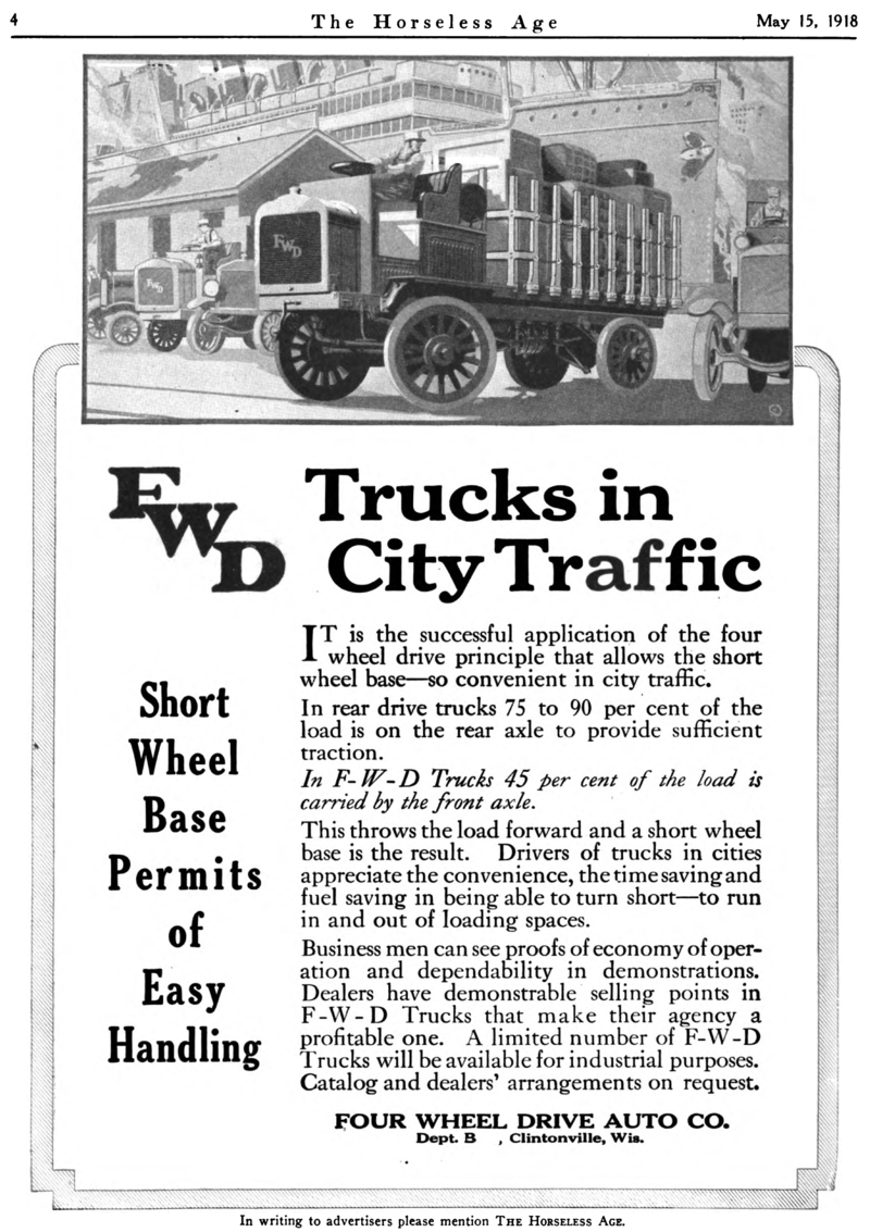 El éxito de la tracción a las cuatro ruedas en las primeras pruebas militares impulsó a la compañía a cambiar de automóviles a camiones. En 1916, el Ejército de EE. UU. encargó 147 camiones Modelo B de tres toneladas para la Pancho Villa Expedition . Durante la Primera Guerra Mundial, el Ejército de EE. UU. encargó 15 000 camiones Modelo B de tres toneladas con tracción delantera, denominados «Camión de 3 toneladas, Modelo 1917», de los cuales se entregaron más de 14 000; también se recibieron pedidos adicionales del Reino Unido y Rusia. [ 4 ] En las dos guerras mundiales , los ejércitos de EE. UU. y sus aliados dependieron de estos vehículos con tracción a las cuatro ruedas. Numerosos camiones Modelo B con tracción delantera, tanto militares como civiles, se conservan en buen estado de funcionamiento; un camión Modelo 1917 del Ejército de EE. UU. en funcionamiento se exhibe en el Museo Militar de Fort MacArthur , en San Pedro, Los Ángeles, California .