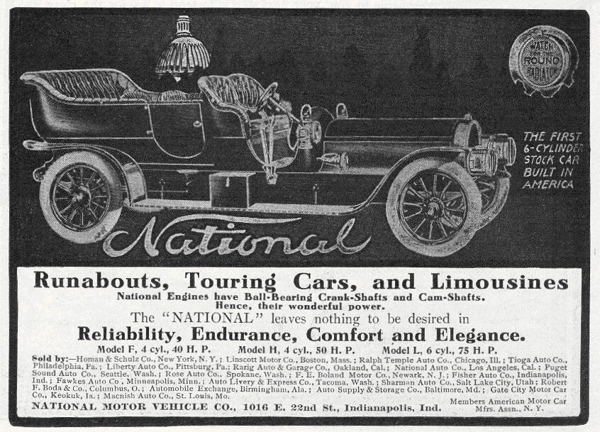 National tuvo la trayectoria más envidiable y exitosa de todos los autos de carreras estadounidenses antes de la Primera Guerra Mundial. Por ejemplo, en 1911, en una combinación de carreras en carretera, carreras de velocidad, subidas de montaña y carreras en pista de tierra, ganaron un total de 84 veces, quedaron segundos 48 veces y terceros 30 veces.