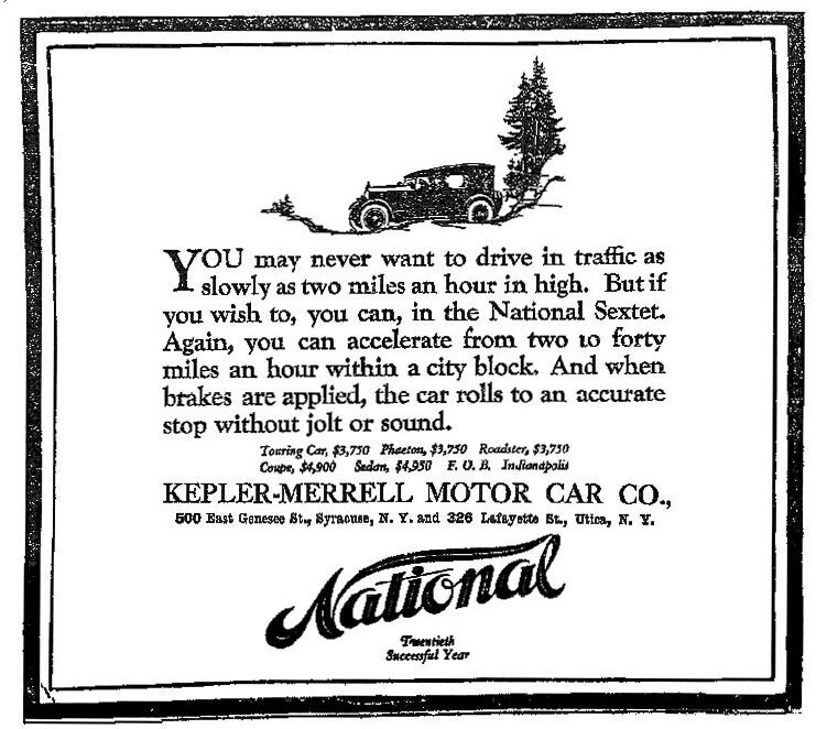 Obligado a aumentar sus precios de venta para contrarrestar los efectos de la inflación de la guerra, National terminó en un rango de precios más alto en el que no podía competir. Para 1920, National abandonó sus modelos Highway Six y Twelves y lanzó un nuevo modelo: el Sextet. El Sextet usaba un motor Continental de seis cilindros con válvulas laterales, modificado por los ingenieros de National con una culata de válvulas en cabeza.