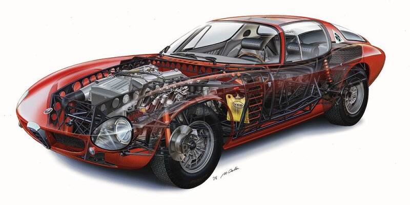 Diseño de Giorgietto Giugiaro. Chasis tubular del Alfa Romeo Giulia TZ, motor de 4 cilindros con 170 cv , caja de cambios de 5 marchas y tracción trasera