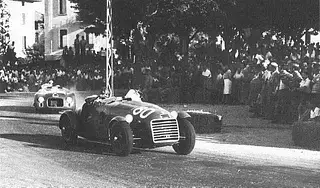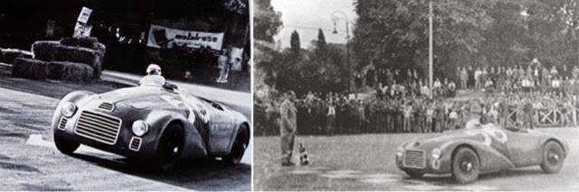 Circuito Vigevano el 15 de junio de 1947 fue Franco Cortese conduciendo el Ferrari 125 S s/n 02C de 1947 hasta un tercer lugar en la general. Izquierda: Maserati A6 Sport barchetta de 1946 conducido por su propietario Guido Barbieri (no terminó). A la derecha: Posiblemente un Stanguellini (obtuvieron el 2.º, 3.er y 4.º lugar).