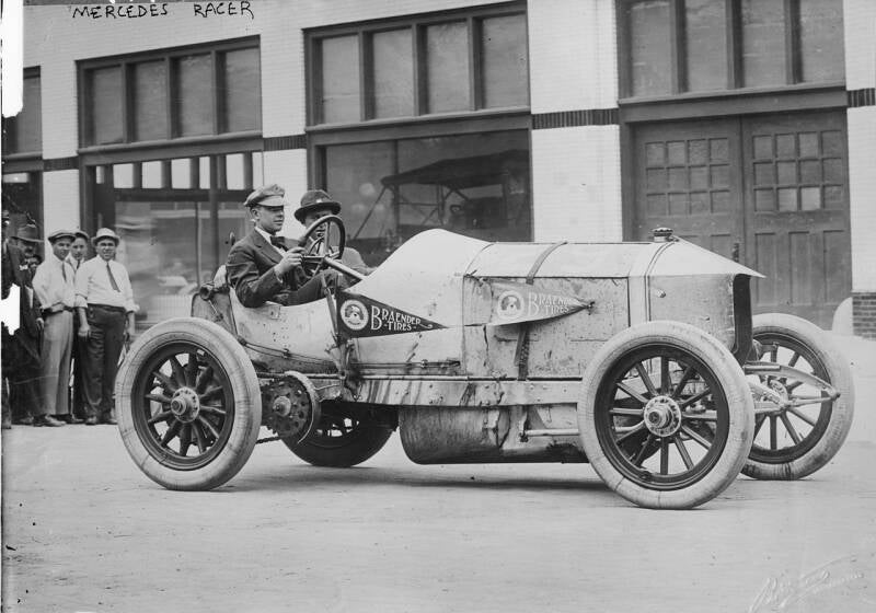 Servicio de Noticias Bain, editor. Un Mercedes GP de 1908 participó en la carrera de Indianápolis de 1913 con neumáticos Braender. El piloto era Ralph Mulford. Terminó séptimo y, curiosamente, condujo toda la carrera con un solo juego de neumáticos Braender. Este es el mismo coche que Ralph DePalma usó en la carrera de Indianápolis de 1912 y, tras liderar durante 196 vueltas, el motor falló y DePalma no terminó. [entre aprox. 1910 y 1915]