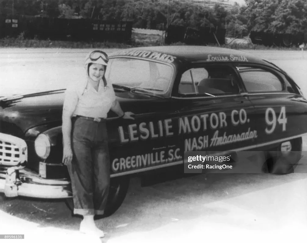 HILLSBORO, CAROLINA DEL NORTE - 29 DE OCTUBRE DE 1950: Louise Smith junto al Nash de Leslie Motor Co. '50 en el Occoneechee Speedway, donde terminó 19.ª en la carrera de 200 millas. (Foto de Archivos ISC/CQ-Roll Call Group vía Getty Images)
