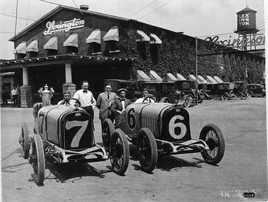Dos coches de carreras en las instalaciones de Lexington Motor Company en Connersville, Indiana, 1920