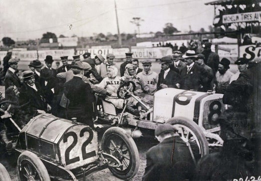 Ralph Mulford y el mecánico Billy Chandler en la carrera de la Copa Vanderbilt que se celebró el 27 de noviembre de 1911 en Savannah, Georgia, siendo ganadores con el coche Lozier nº 8.