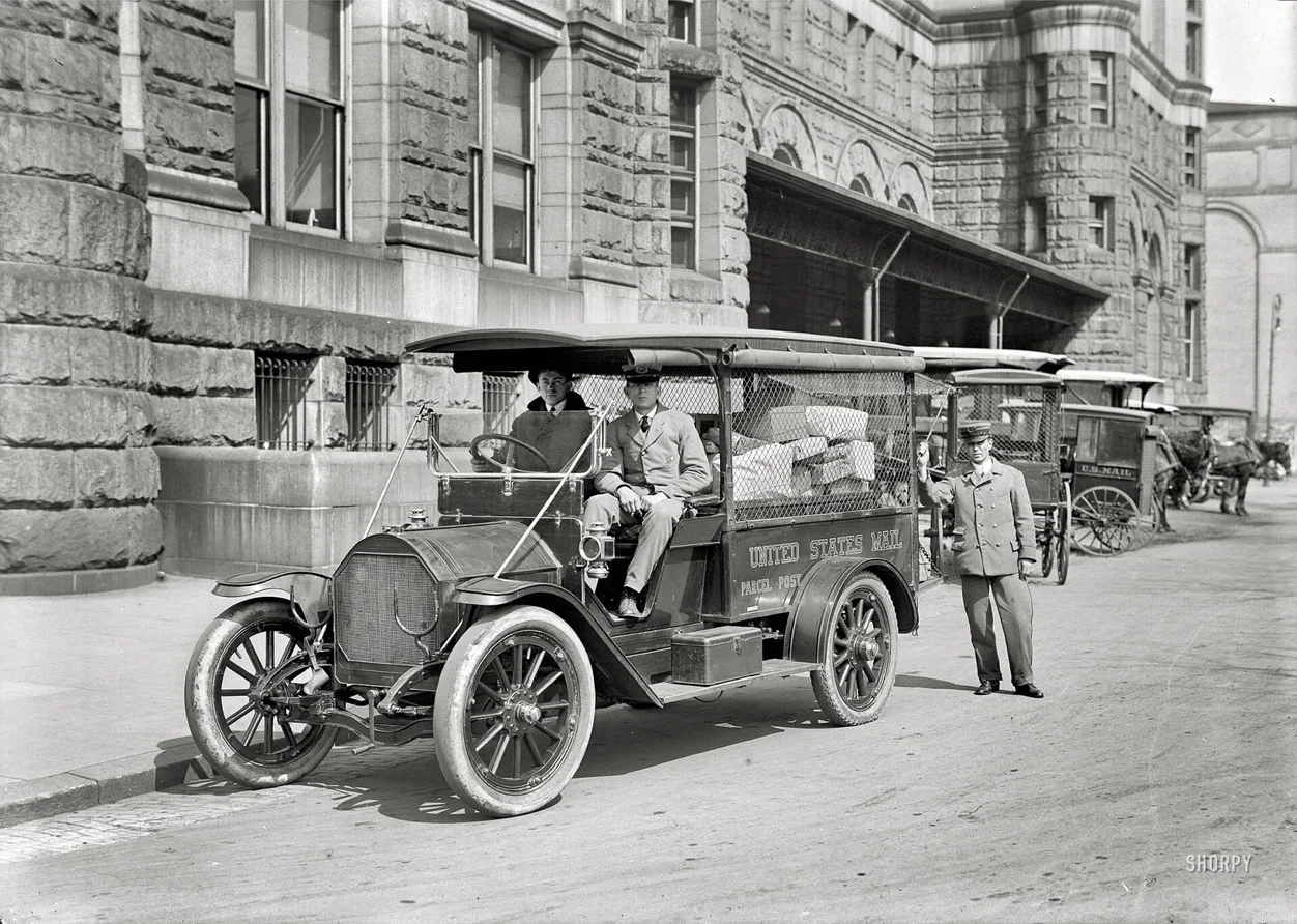 Washington, D.C., 1914. "Departamento de Correos - paquetería". Una imagen del exterior de la oficina de correos en la Avenida Pensilvania durante su último año de operaciones, antes de su traslado y el edificio pasara a conocerse como la Antigua Oficina